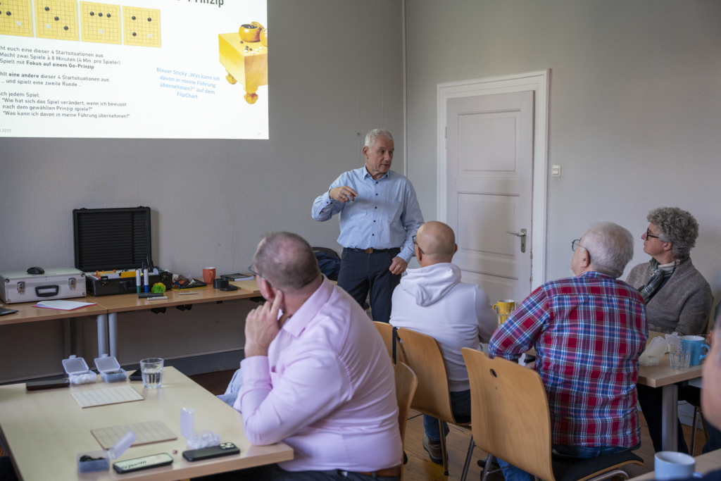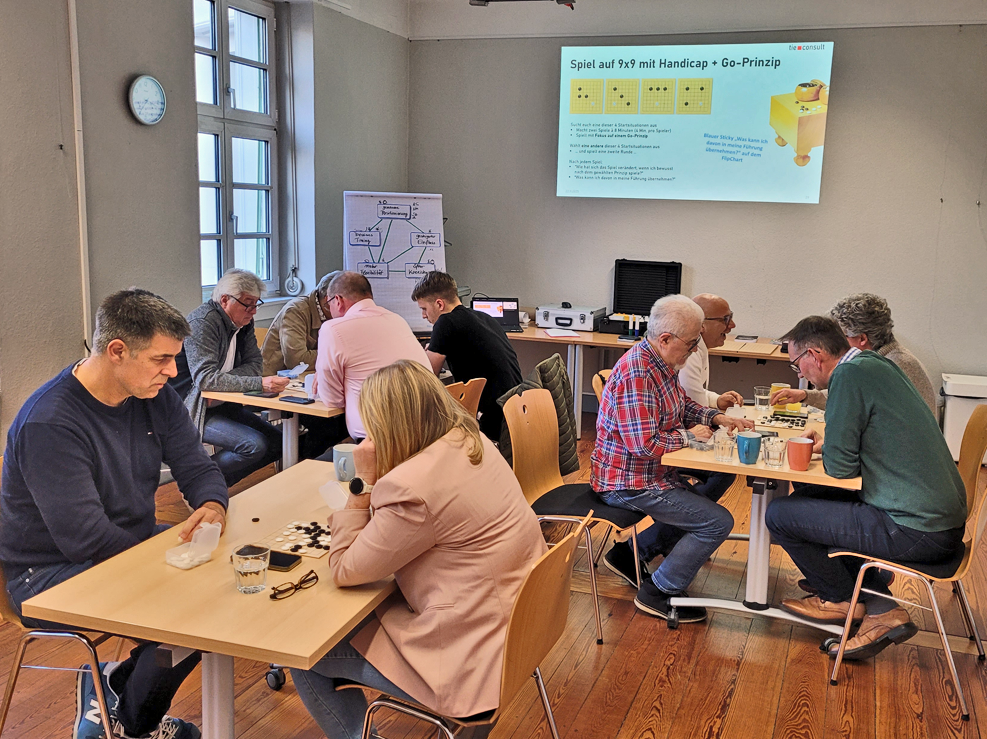 Anschließend haben wir die zentralen Go-Prinzipien ausführlich besprochen, mit Situationen auf dem Spielbrett visualisiert und in mehreren Go-Spielrunden unmittelbar erfahrbar gemacht. Im Fokus stand dabei der Transfer auf den Führungsalltag: